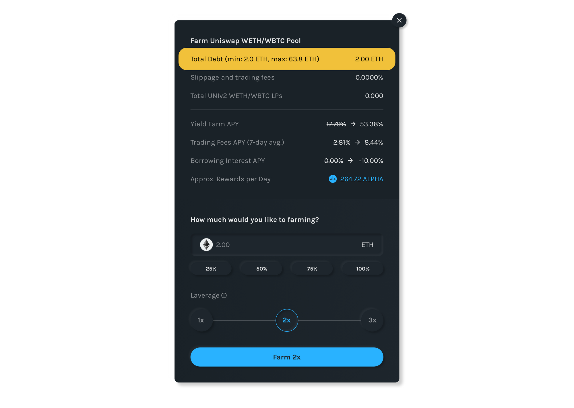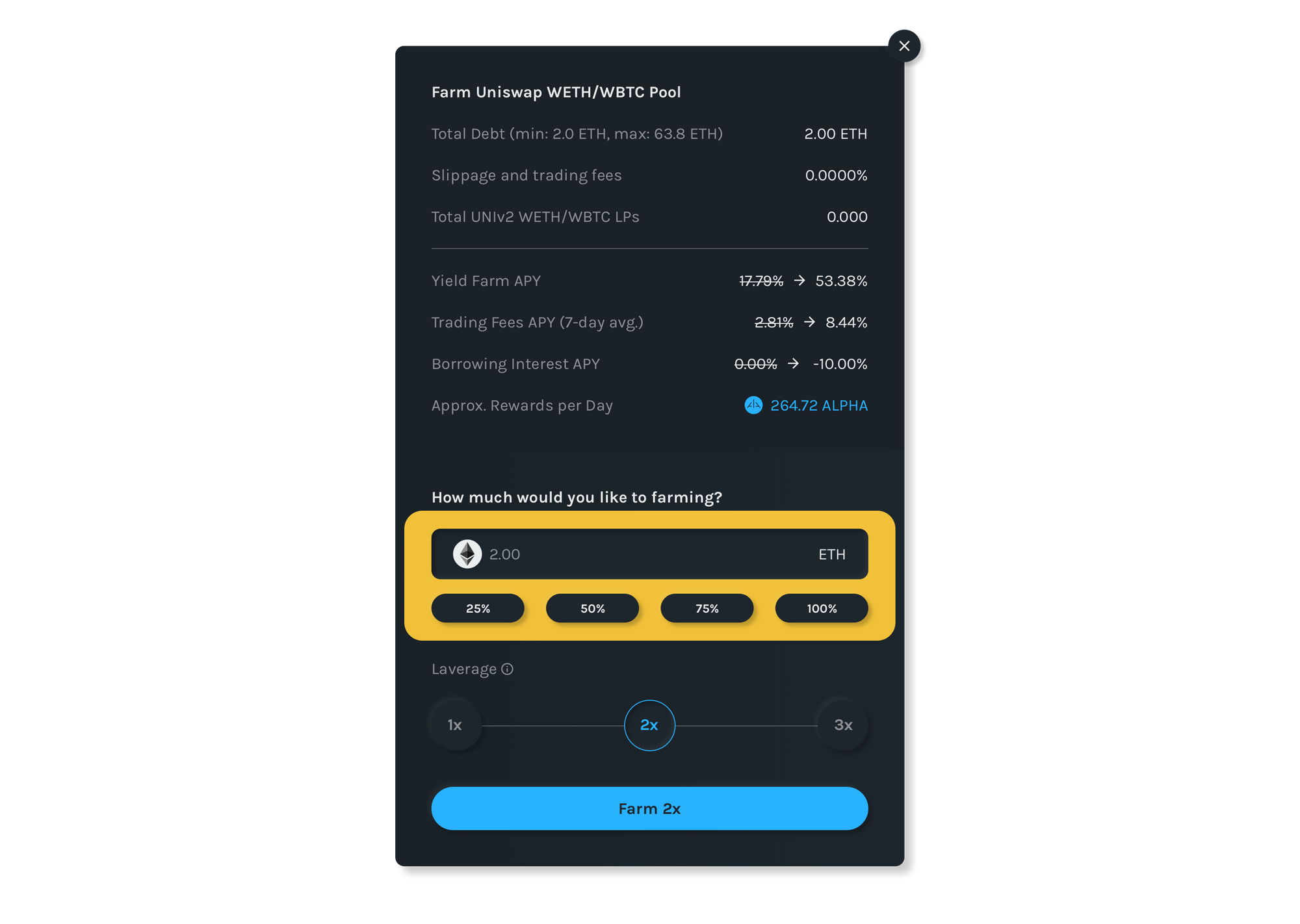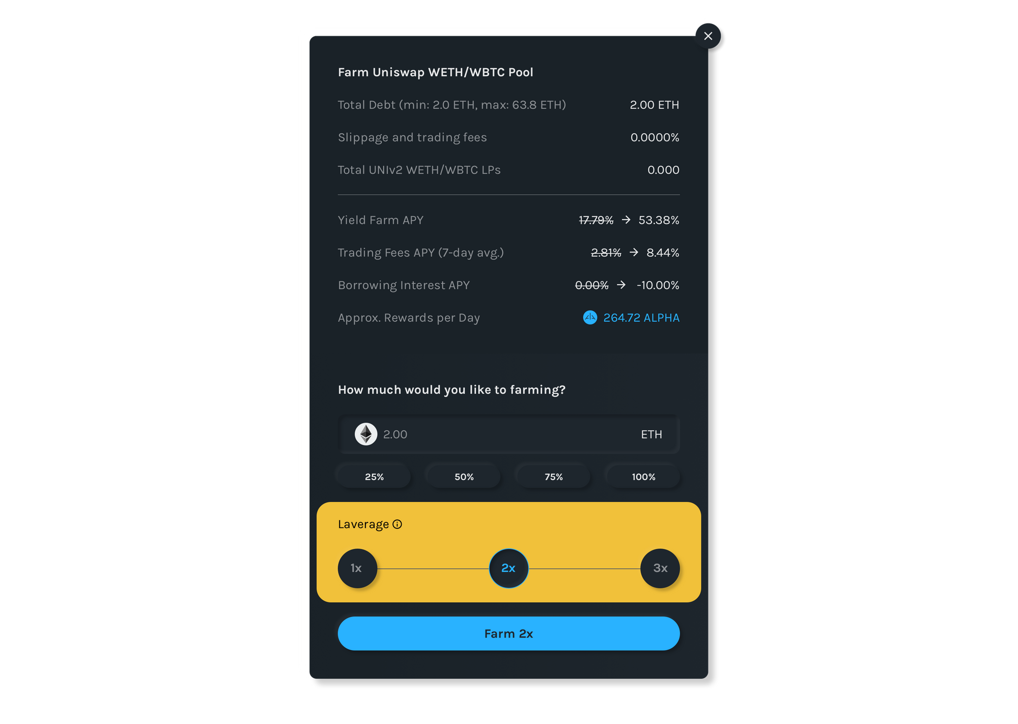 - Select pool to farm by clicking on Farm 2.5x (or 1.75x) button. Note, you can open up to 2.5x leverage on the 4 Uniswap pools and 1.75x leverage on IndexCoop pool