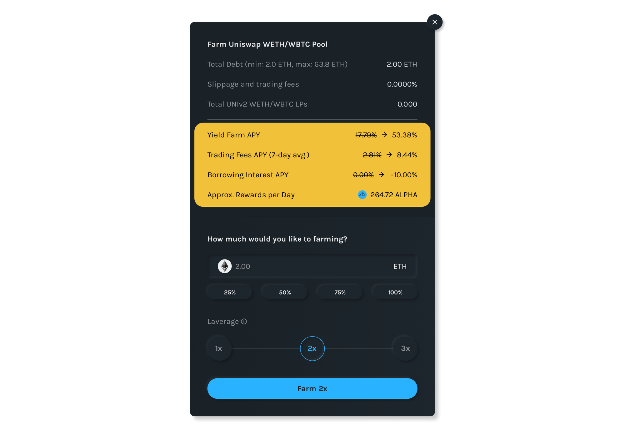 4. For example, by farming with 2 ETH and selecting 2x leverage, you are telling Alpha Homora to borrow an additional 2 ETH for you to farm as well. Your final position is then 4 ETH.