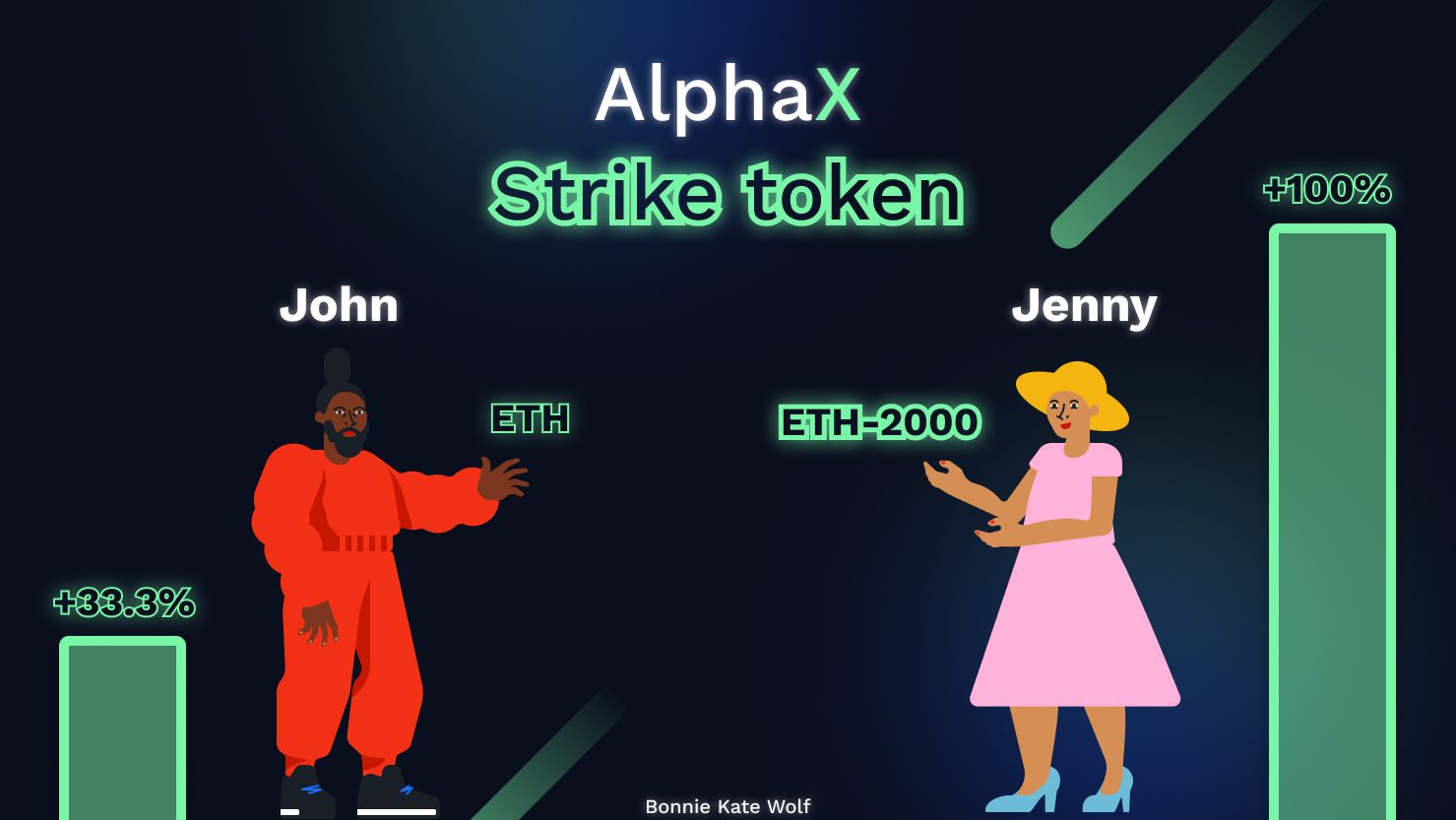 Jenny gains $1000 by investing $1,000 on the ETH Strike token, three times bigger than what John made. This is because by investing in the ETH-2000 Strike token, Jenny is basically exposing herself to 1 ETH token with only $1,000 (3000 - 2000). With this, her capital efficiency becomes 3X (Actual asset price (3000) / Strike token price (1000)). Hence, whatever John made, she will always make 3X of that.