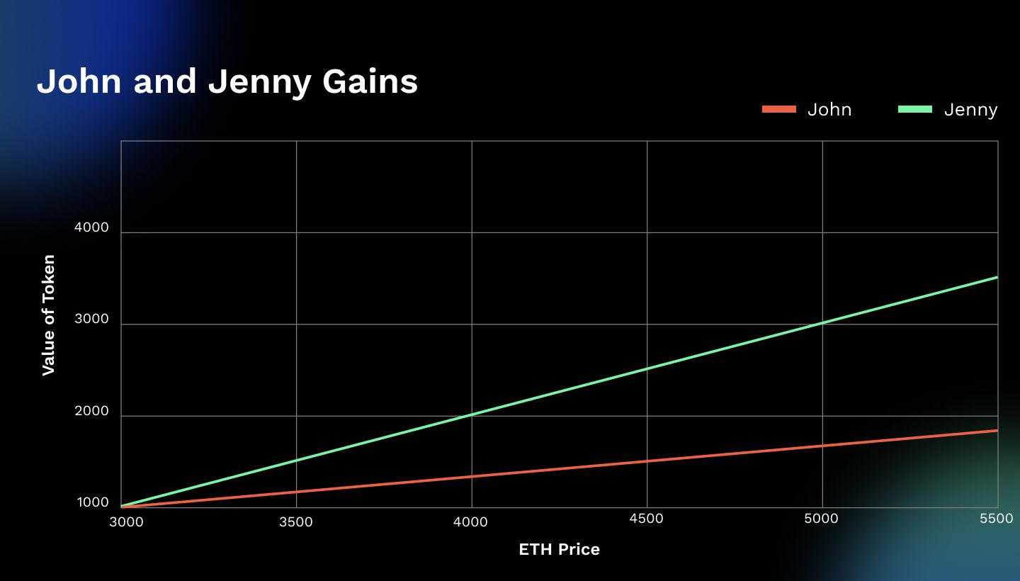 Why has John become so shocked? Let’s compare the siblings gain when ETH price rises by $1,000 or ~33.3%.