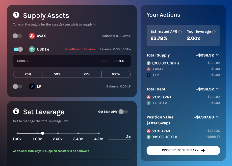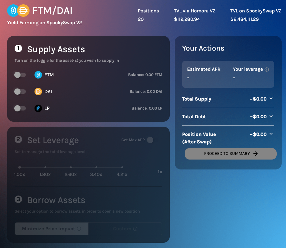 Another point we wanted to emphasize through this revamp is the ability to open a position with just a single asset (without needing multiple assets) on Homora V2 by adding the toggle feature. Users can simply toggle on the asset(s) they would like to supply and Homora will help borrow the additional assets accordingly based on user needs and leverage. This feature also comes with the ability for users to simulate their positions beforehand even without the assets. Even without the amount of assets, users can input any amount to have a quick estimation of expected returns. However, we will display an error message stating that users have insufficient balance and will be unable to confirm before opening an actual position.