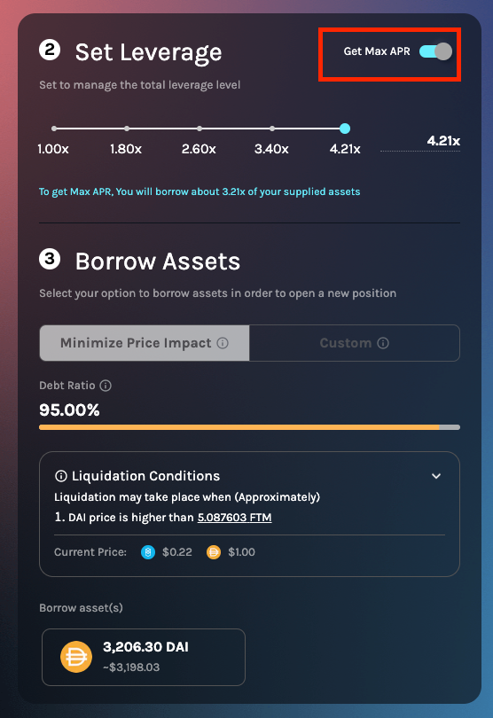 Homora’s ability to achieve higher APR through leveraged position is one of the key highlights of our protocol. However, in the past, many users have raised the concern that they were unable to achieve the high APR as advertised in the farm pool page. We realized the way we calculated the max APR may not be as intuitive to users. Thus, we have implemented a new feature where users can get the max APR as advertised in one-click. This option will let Homora automatically set the optimal leverage level and borrow asset(s) with a lowest interest rate to help maximize your return. For users looking for the highest yield, you can try out this feature and let us know what you think!