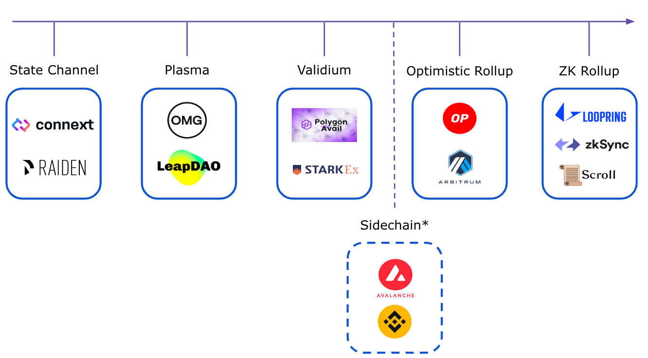 To increase the scalability of Ethereum, multiple approaches were developed in the past and many more are currently under research. These solutions include State Channels, Plasmas, Validiums, Rollups, and Sidechains.