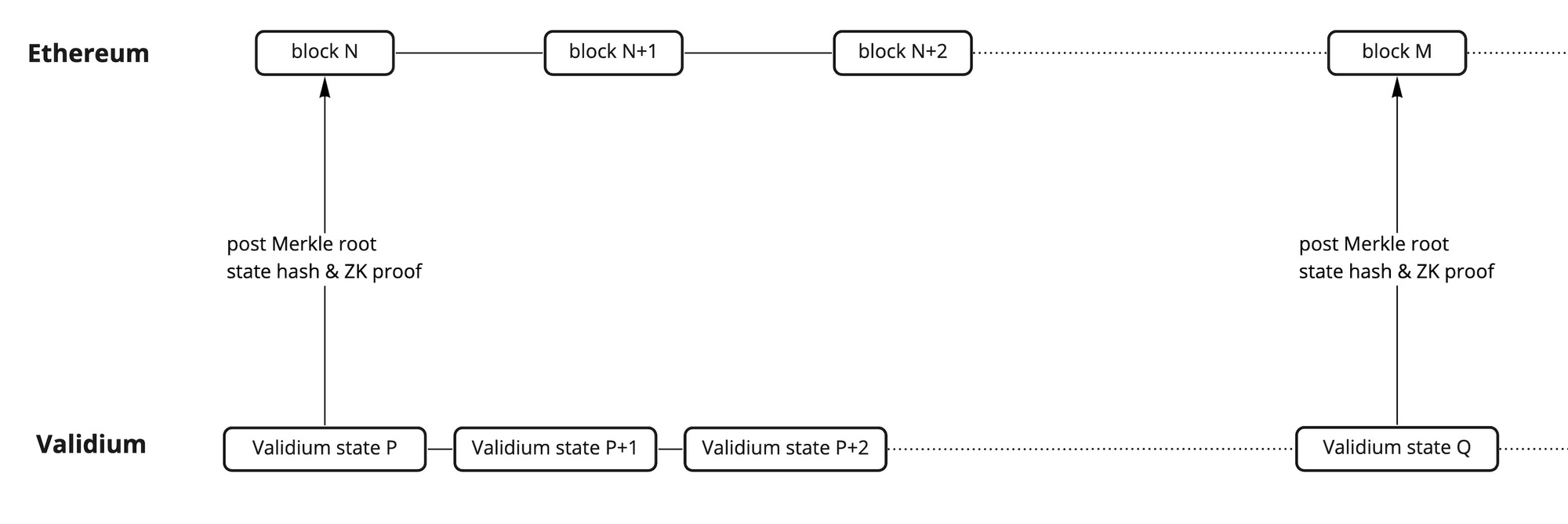 Validium also runs its own blockchain and posts Merkle root state hashes onto Ethereum, similar to Plasma. Their key difference is in the state update validation mechanism. While Plasma relies on a fraud-proof mechanism, Validium utilizes zero-knowledge (ZK) proofs such as ZK-SNARKs and ZK-STARKs.