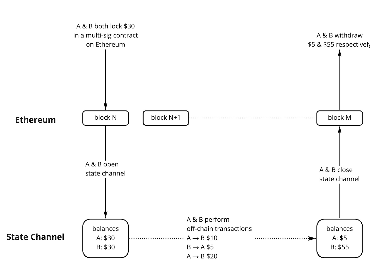 To generalize the idea, a group of participants can open a state channel and lock funds in the channel’s multi-sig smart contract on Mainnet. They can then settle transactions off-chain among themselves and only update the final state to Ethereum upon agreement to unlock the funds and close the channel.
