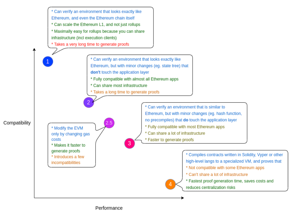 Similar to Validium, ZK rollups are not effectively compatible with EVM yet as generating proof for fully integrate EVM environments can take hours to complete. Projects that pursue the development of ZK rollup with EVM, or ZK-EVM, are balancing the tradeoffs between EVM compatibility and performance. In fact, Vitalik classifies ZK-EVM into 4 types, ranging from being fully Ethereum equivalent to partial EVM-compatible as shown in Figure 1.