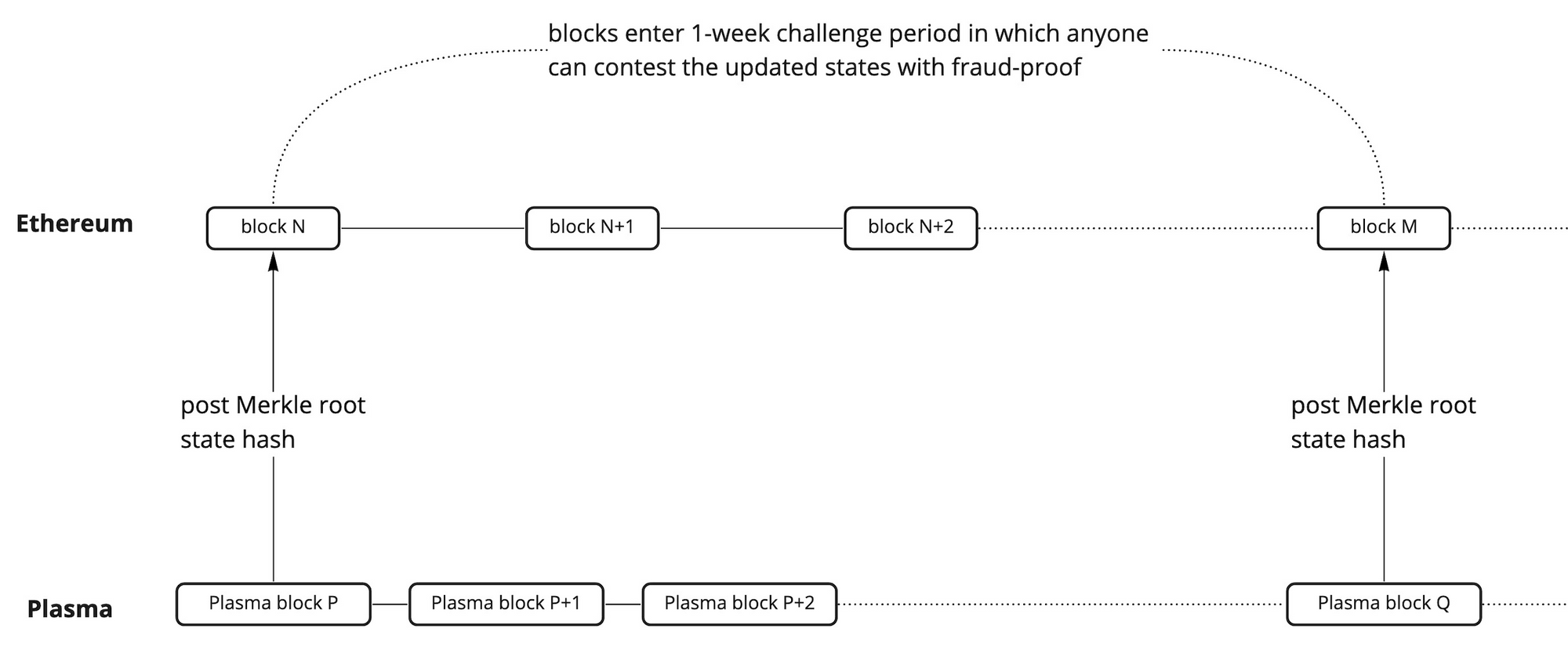 To ensure state transitions are correct, Plasma adopts the fraud-proof mechanism. Each transition is deemed as correct until someone challenges it within the time period (by providing proof to invalidate the transition). Any incorrect state transitions will simply be dropped, and newer transitions will just build on top of the previously correct ones.
