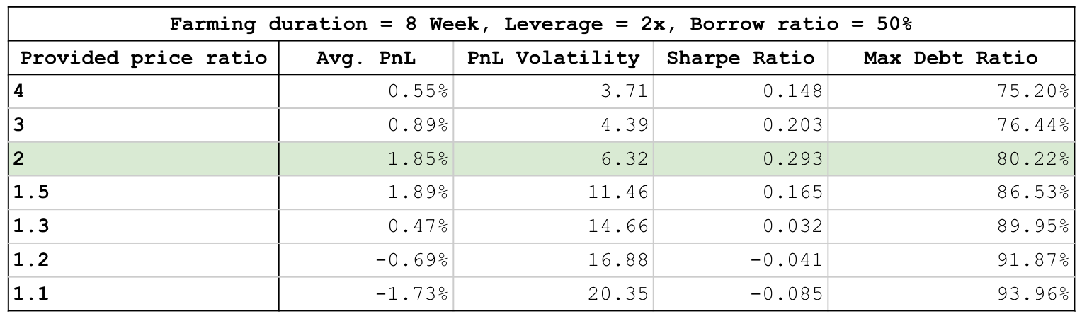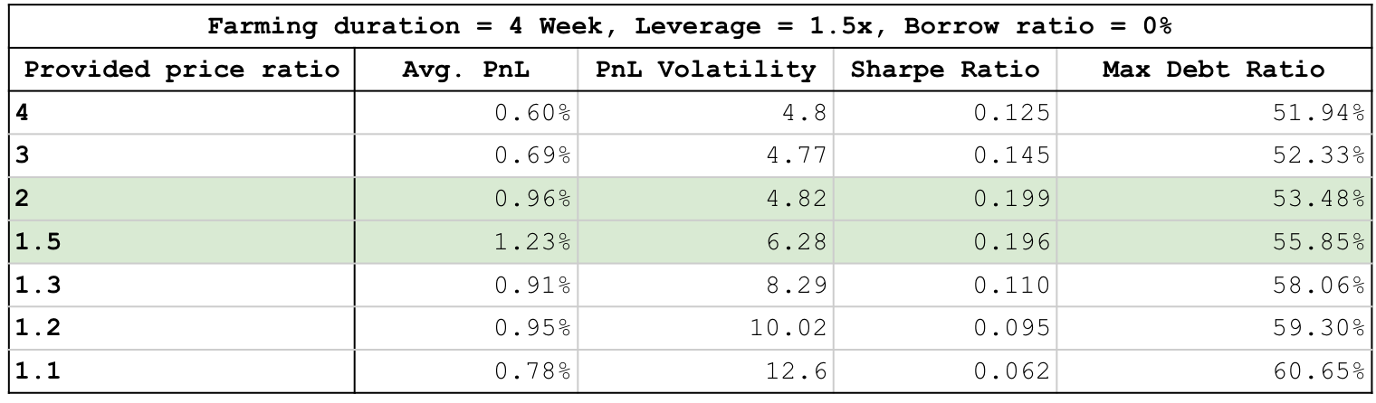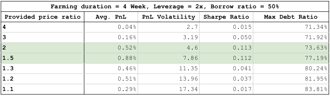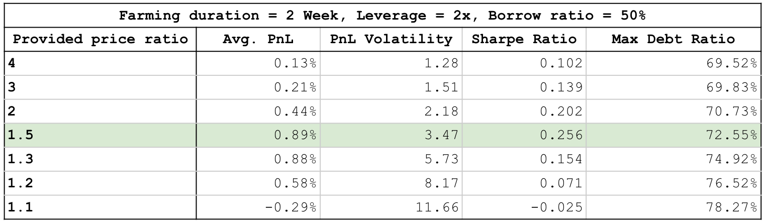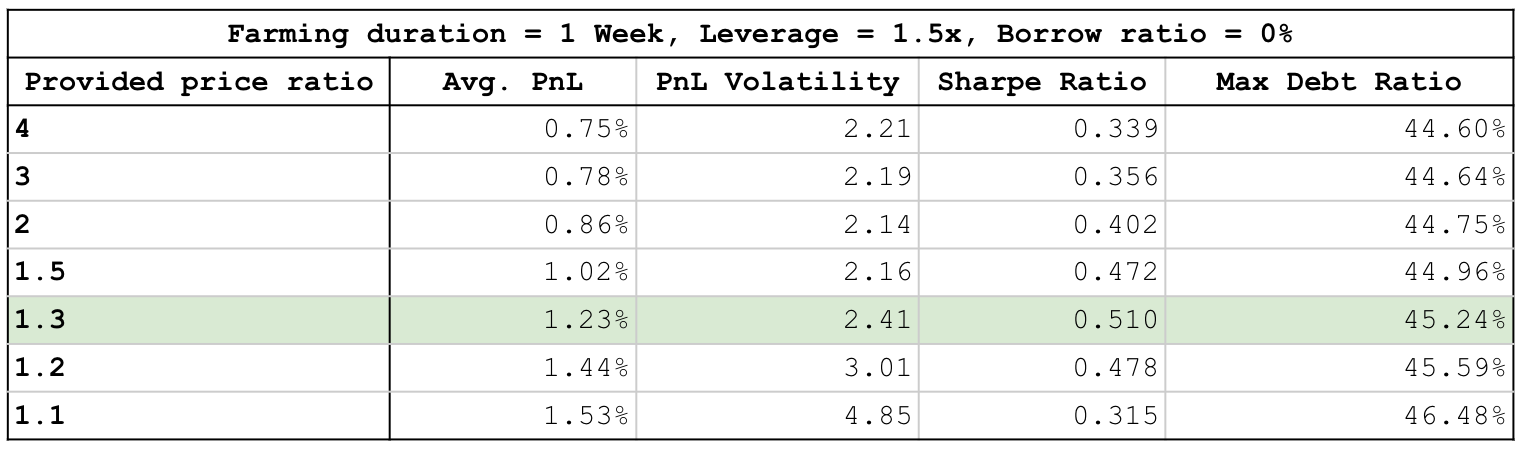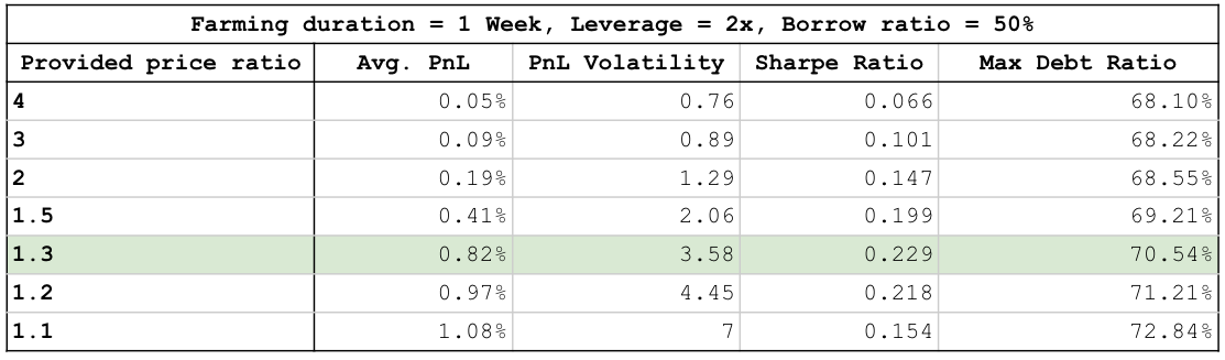 Lastly, short farming durations (1 week) are more suitable for lower PPR values. As shown in Table 5 illustrating the results using the leverage of 2x and borrow ratio of 50%, the optimal PPR points to 1.3.