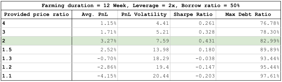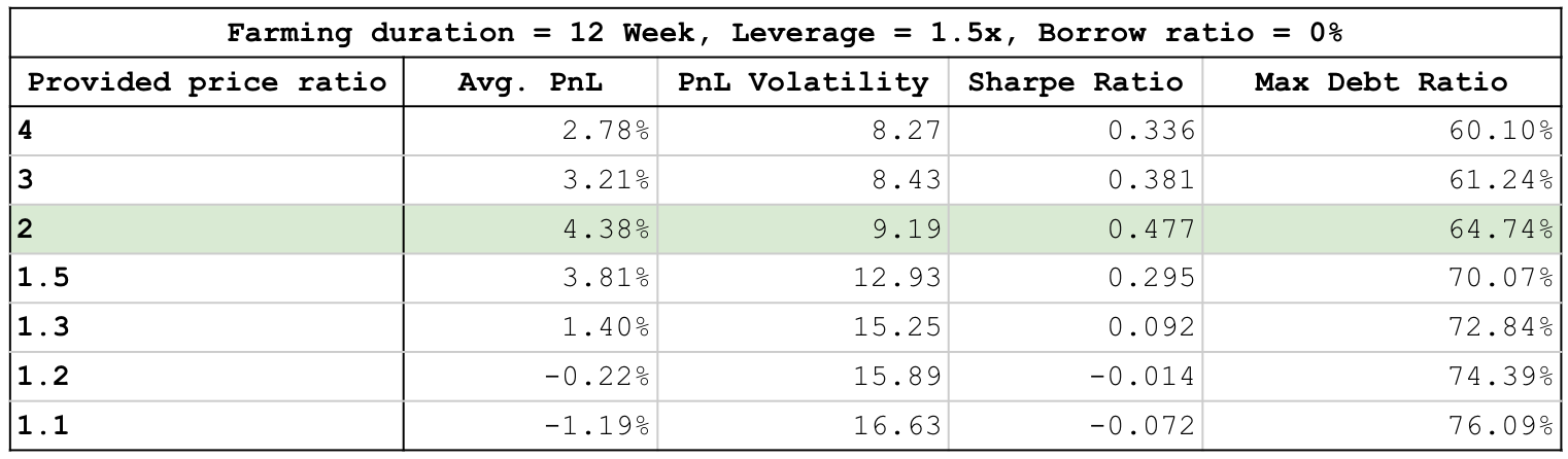 In long-duration farming (up to 12 weeks), our data show that a PPR of 2 outperforms other PPR values, having the highest average PnL and Sharpe ratio while maintaining the max debt ratio in the safe threshold as shown in Table 1 and Table 2.