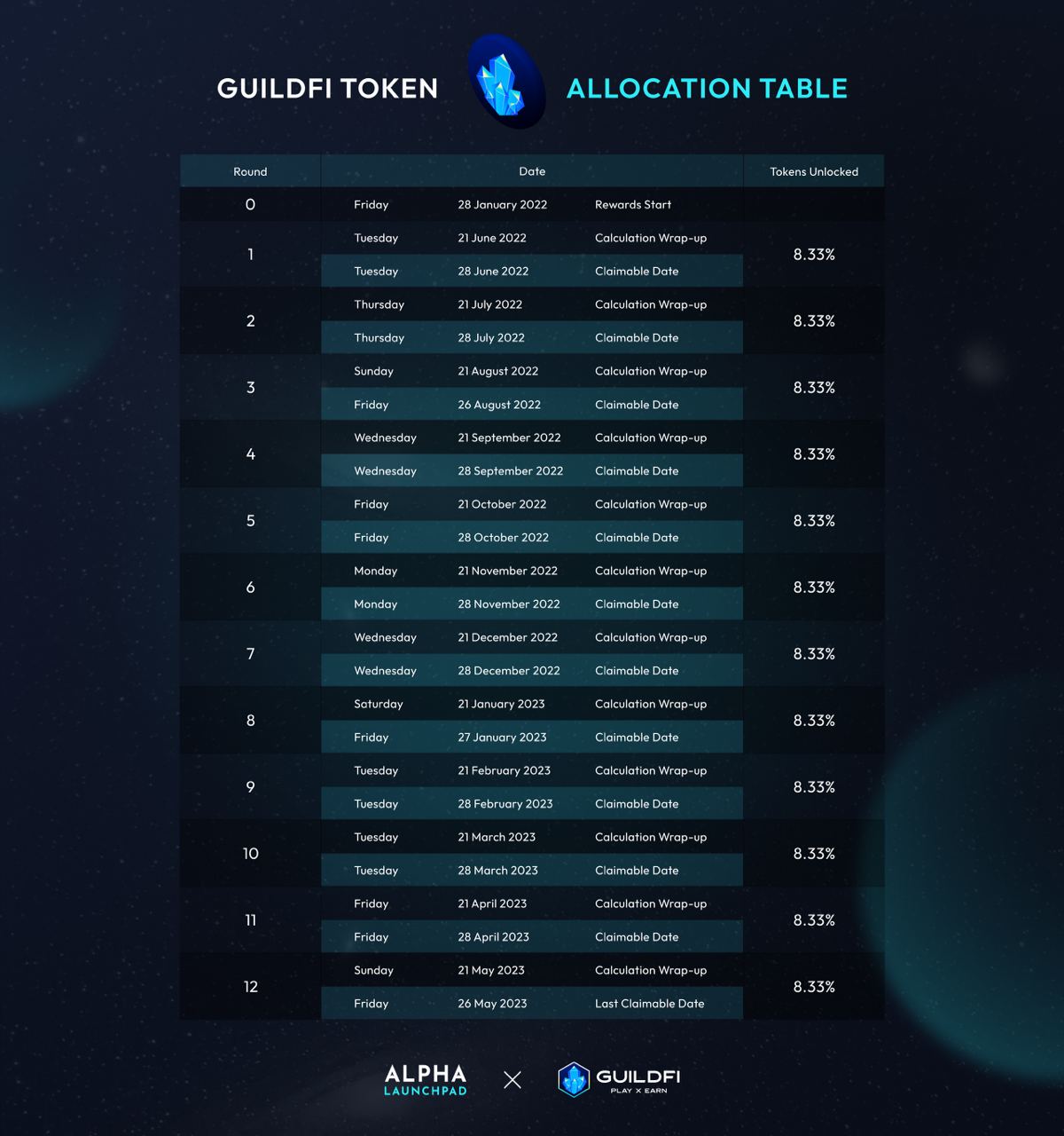 The claimable period will commence at the end of the 6th month and continue until the end of the 17th month after the lock-up period begins on Jan 28th. This means the allocation of GF will be distributed to ALPHA over the span of 17 months with a total of 12 claimable rounds. Allocation will be equally divided and unlocked each time by 8.33%, or ~834K GF tokens.
