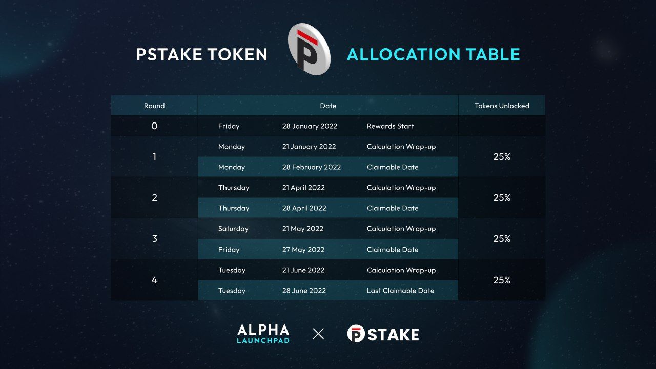 The claimable period will commence at the end of 1st, 3rd, 4th and finally 5th month after the lock-up period begins on Jan 28th. This means the allocation of PSTAKE will be distributed to ALPHA over the span of 5 months with a total of 4 claimable rounds. Allocation will be equally divided and unlocked each time by 25%, or ~2M+ PSTAKE tokens.