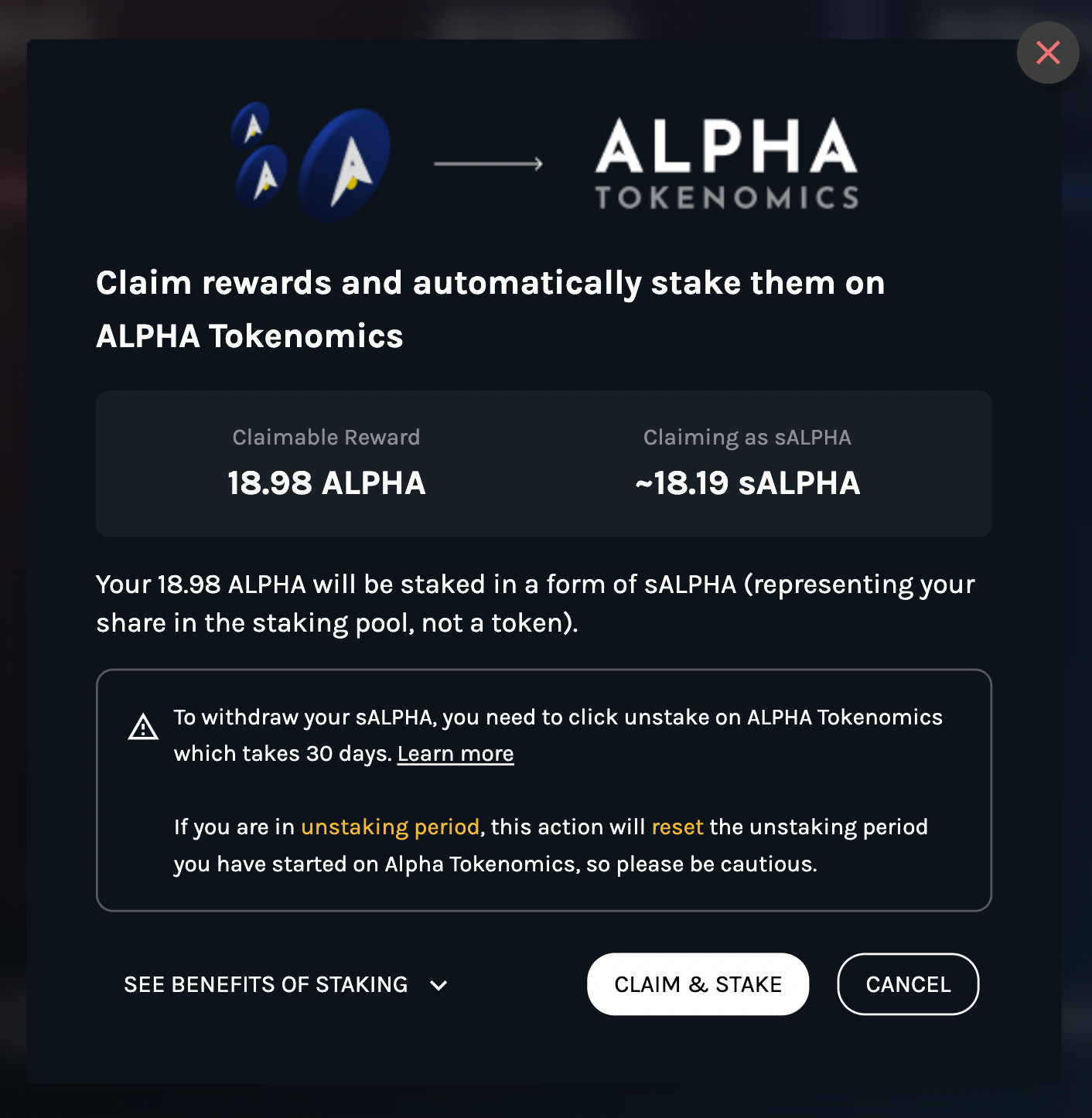 ⚠️ NOTE: This will action will stake ALPHA. If you have started the unstaking period on Alpha Tokenomics, this action will reset the 30 days countdown.