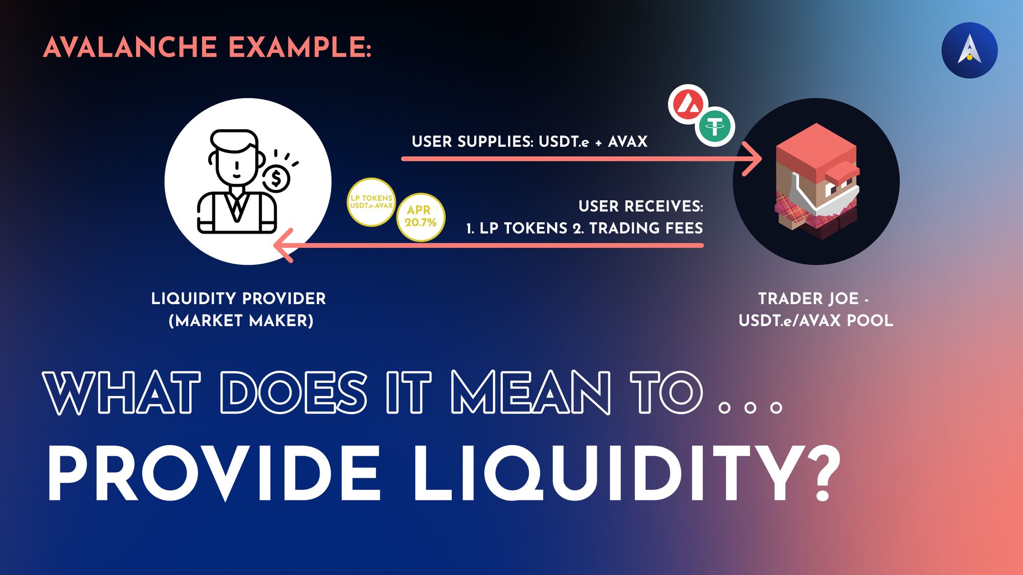 A liquidity provider or some may know it as a market maker, is someone who provides their crypto assets to a DEX protocol to help create a decentralized form of trading. In return, these liquidity providers are given two things: The LP tokens that represent their liquidity provider’s share of the pool and a portion of the trading fees (according to the share of the pool you have) paid by those who trade against this liquidity pool. For instance, imagine providing USDT.e and AVAX to the USDT.e/AVAX liquidity pool on Trader Joe. Today, users can earn up to 20.7% APR from the fees generated by trade and LP tokens representing their share of the pool.