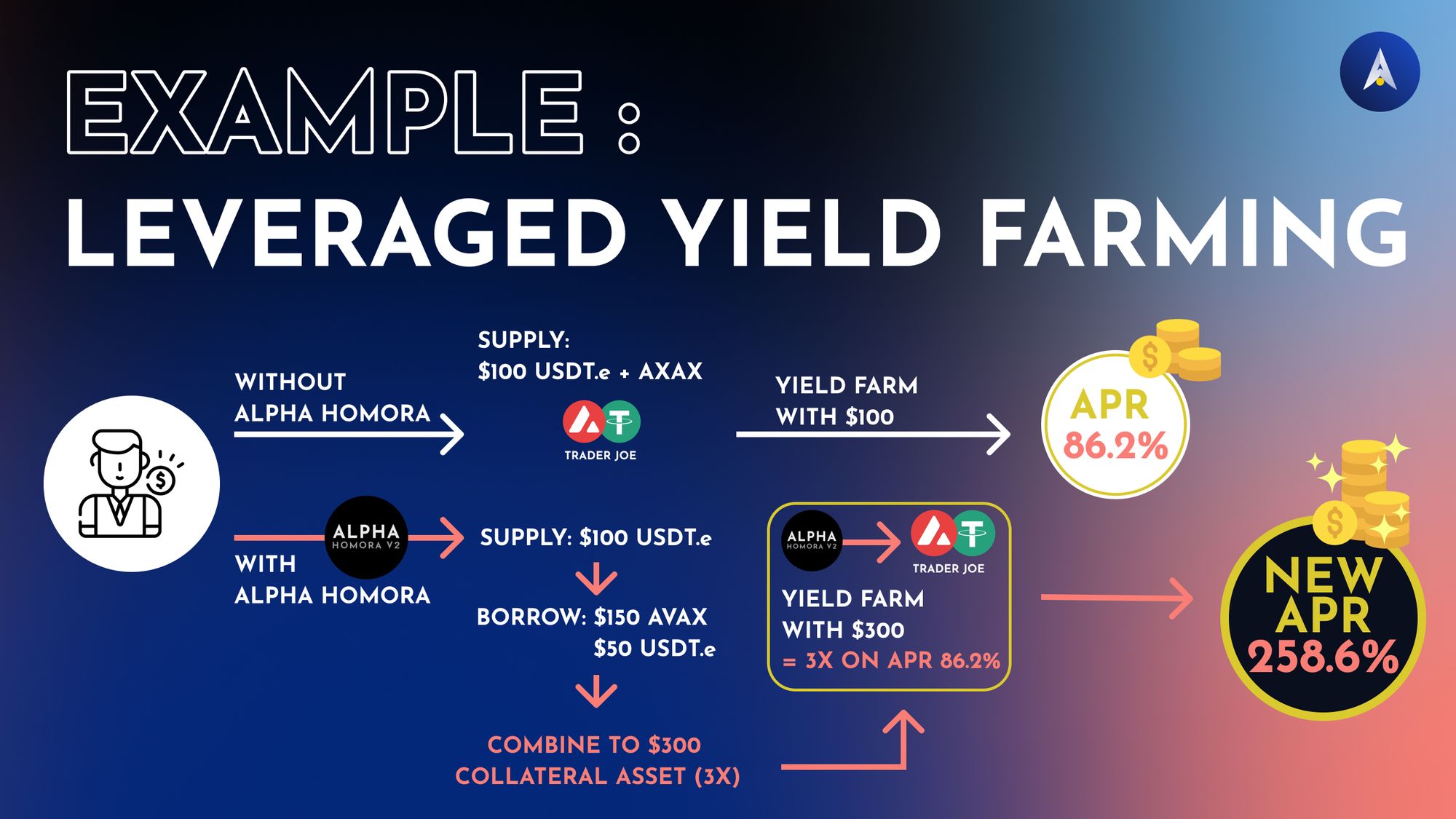 For instance, on Alpha Homora V2, you can supply $100 of USDT.e and borrow $200 of AVAX. Therefore, by combining both assets, you will have a total of $300 of collateral assets. This is then used to leverage yield farm, in which the reward is the return on $300, translating into 3X of the original APR/APY.