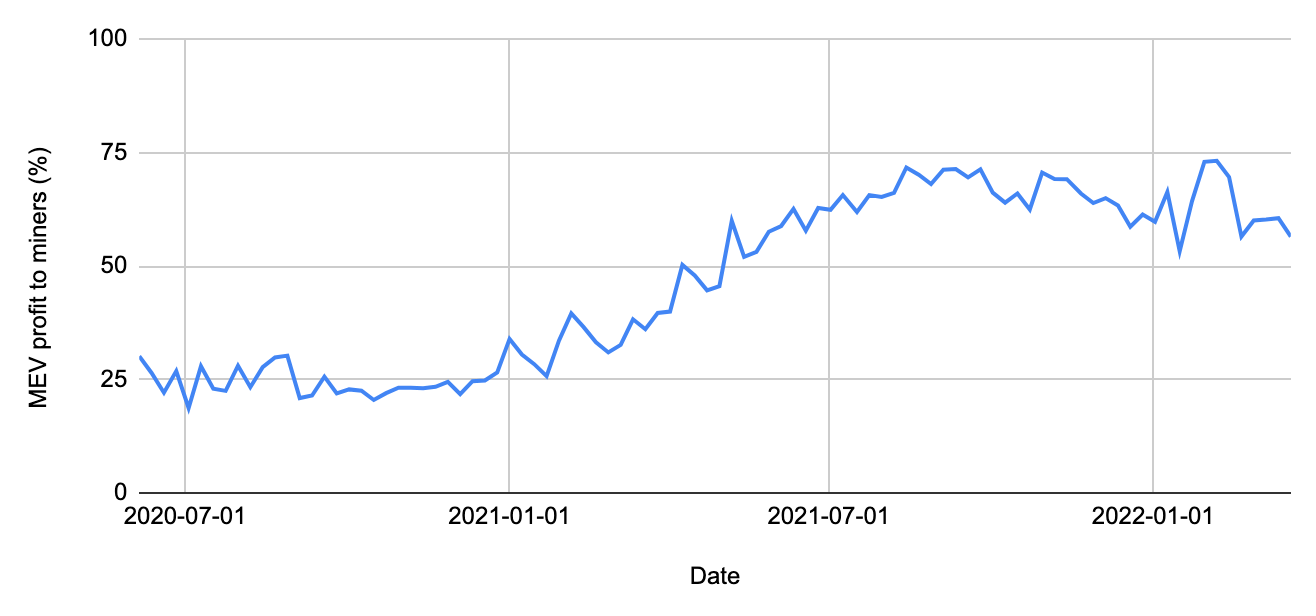 Currently, the two parties – searchers and miners – share the MEV profits. The miner's share started low and grew over time due to more intense competition among searchers as displayed by the graph below of the average MEV shares miners receive from June 2020 to March 2022. Some of these transactions are offering as much as ~95% of MEV profit.