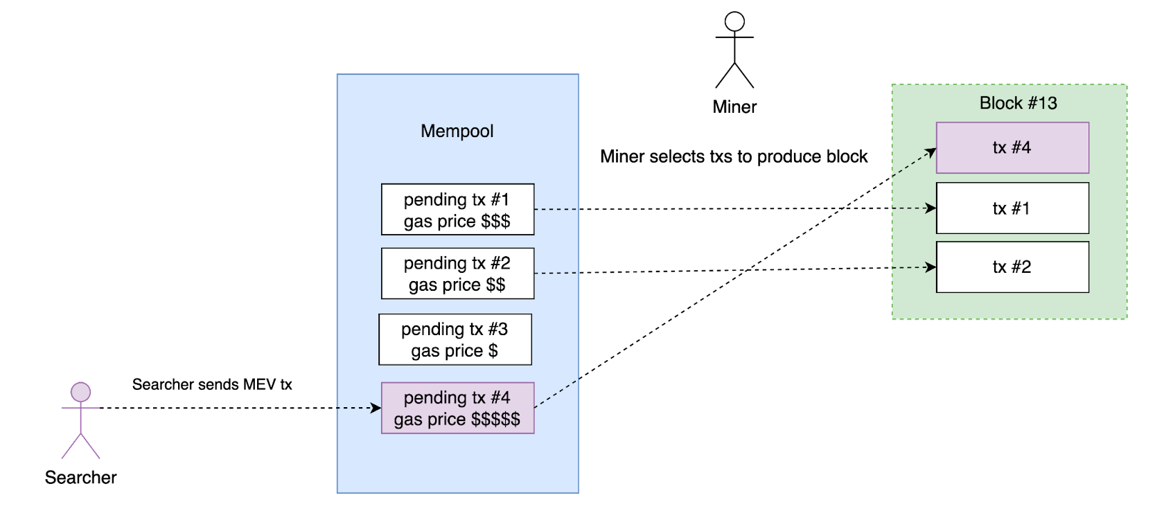 As MEV opportunities become more well-known, more searchers start to enter the game. The competition between searchers arises as there can only be one winning transaction that successfully extracts the MEV opportunity. Searchers secure their victory by bidding higher gas prices, incentivizing miners to put their transactions before others'.