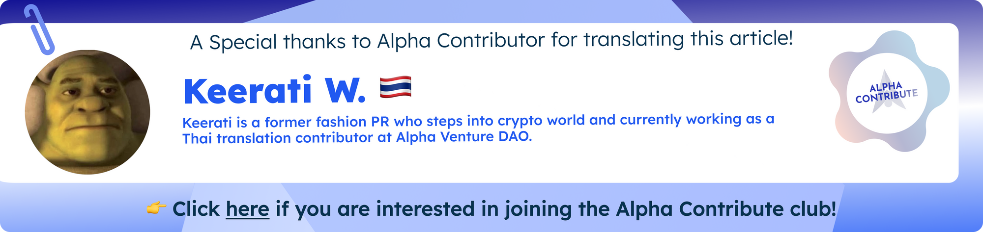 ถ้าคุณสงสัยว่าการได้รับคำปรึกษาจากคอมมิวนิตี้ชั้นนำที่กำลังเติบโตใน Web 3.0 อย่าง Alpha Network ทำงานอย่างไรใน Alpha Incubate ฟังเพิ่มเติมที่นี่ Tascha ผู้ร่วมก่อตั้งของเราพูดคุยเกี่ยวกับวิธีที่เราเสนอการให้คำปรึกษาแบบเฉพาะสำหรับคุณ!