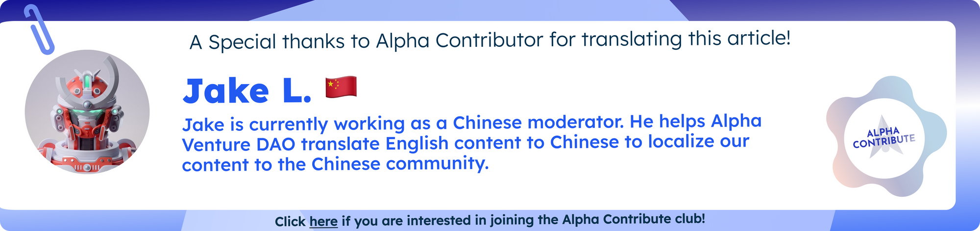Alpha Venture DAO是由建设者组成的并且在Web3的边缘地带进行探索和创新的DAO,目标是为Web3用户带来重大价值,并为Alpha社区带来Alpha回报。加入我们的Telegram/Discord获取最新信息,在推特上关注我们,或者在我们的博客和文档中阅读更多关于我们的信息!