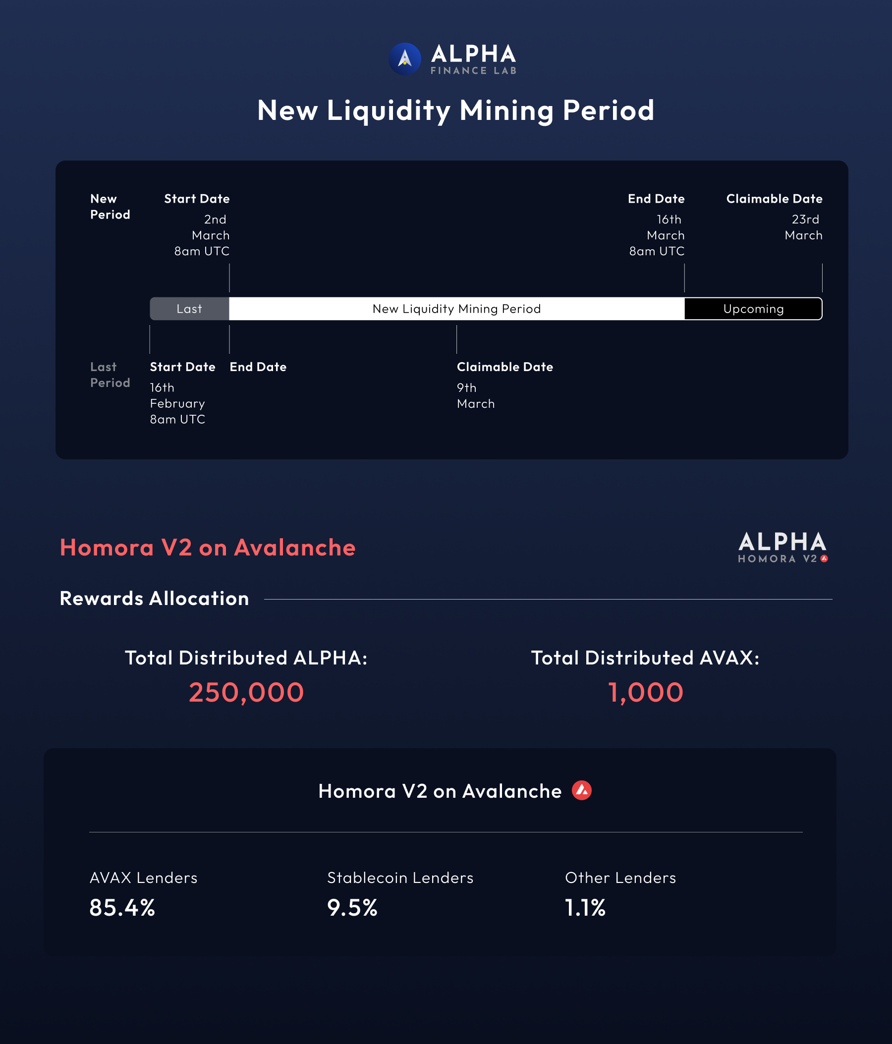 The new liquidity mining period and when to claim ALPHA & AVAX rewards will be:
