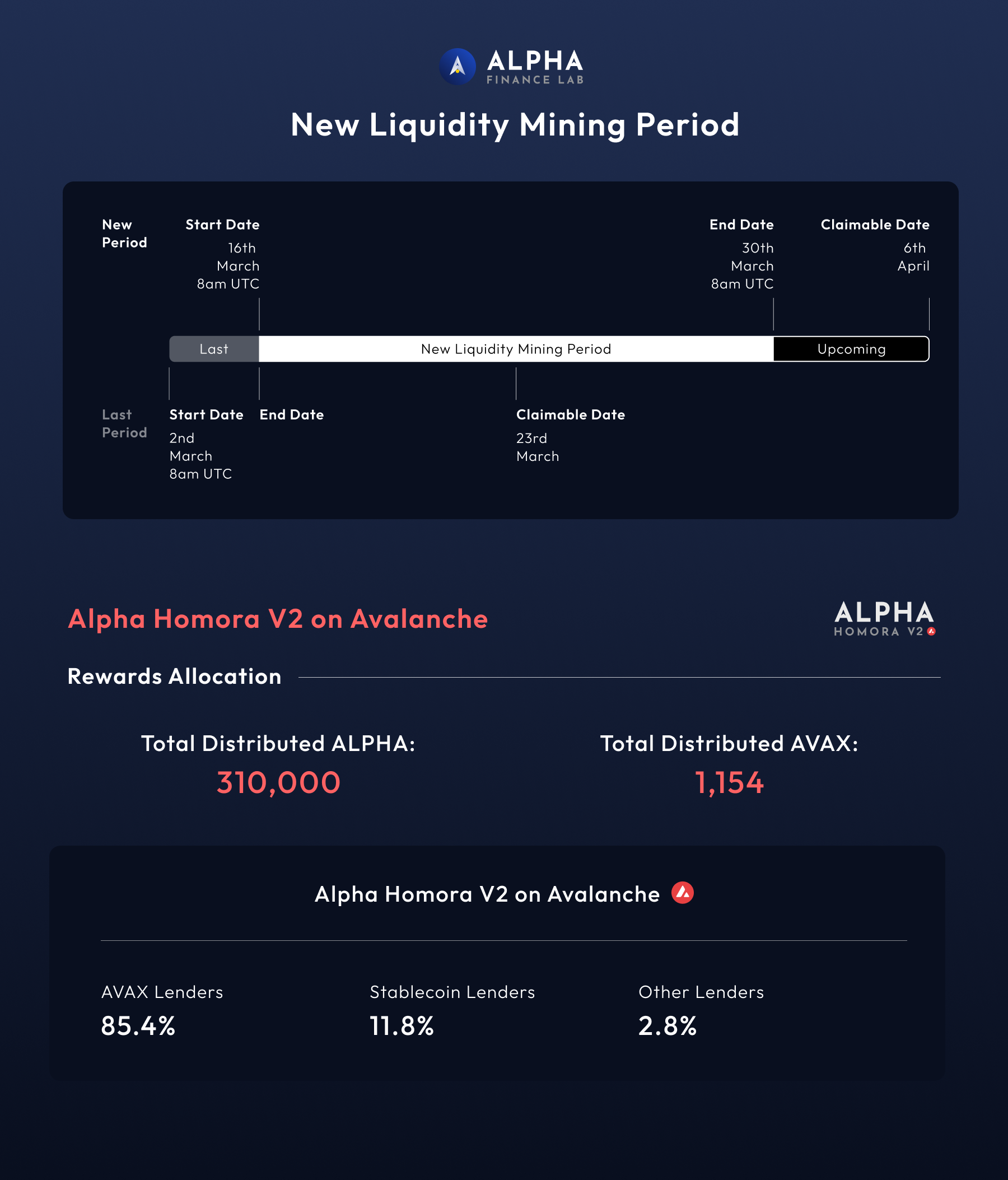 The new liquidity mining period and when to claim ALPHA and AVAX rewards will be: