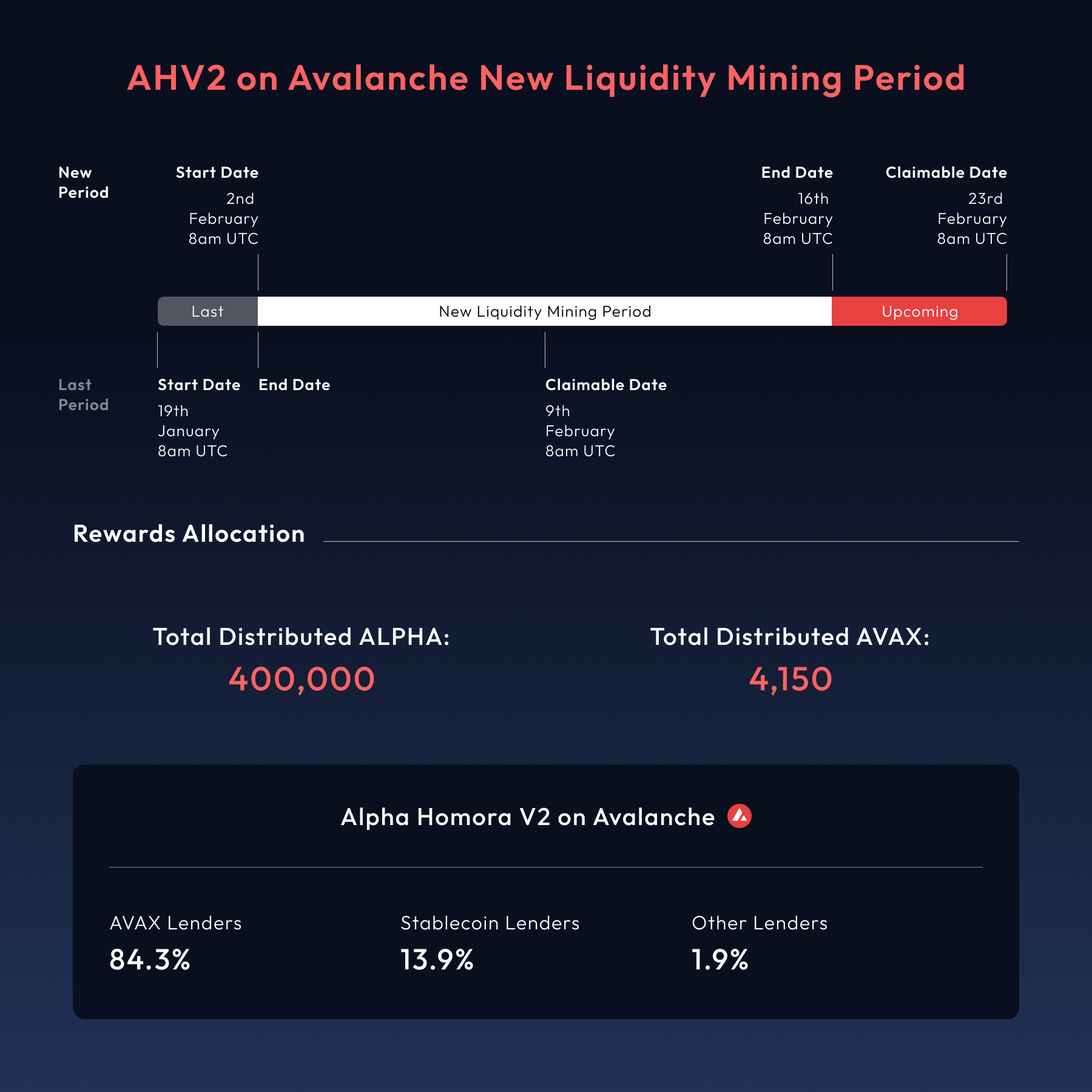 Announcing the new liquidity mining period for Alpha Homora V2 on Avalanche: February 2nd 8am UTC - February 16th 8am UTC.