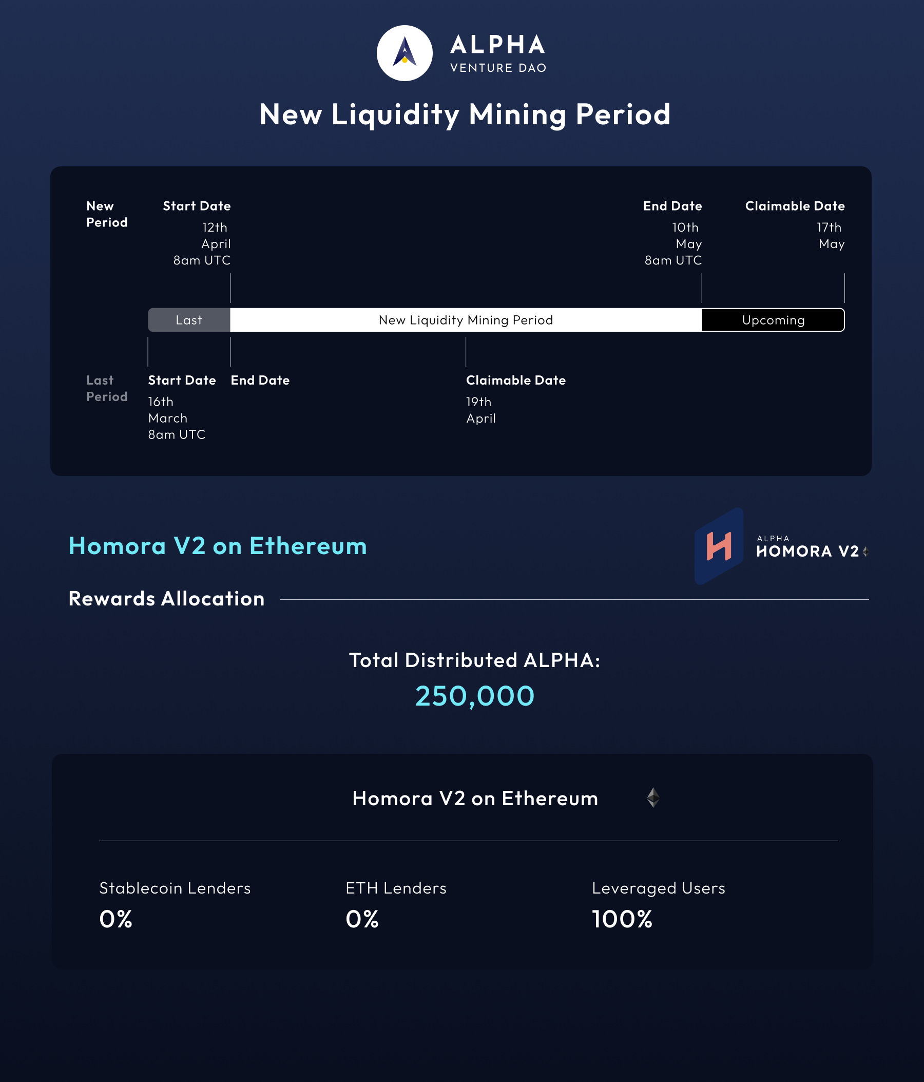 This will be the last liquidity mining period to distribute ALPHA as reward for Homora V2 on Ethereum.