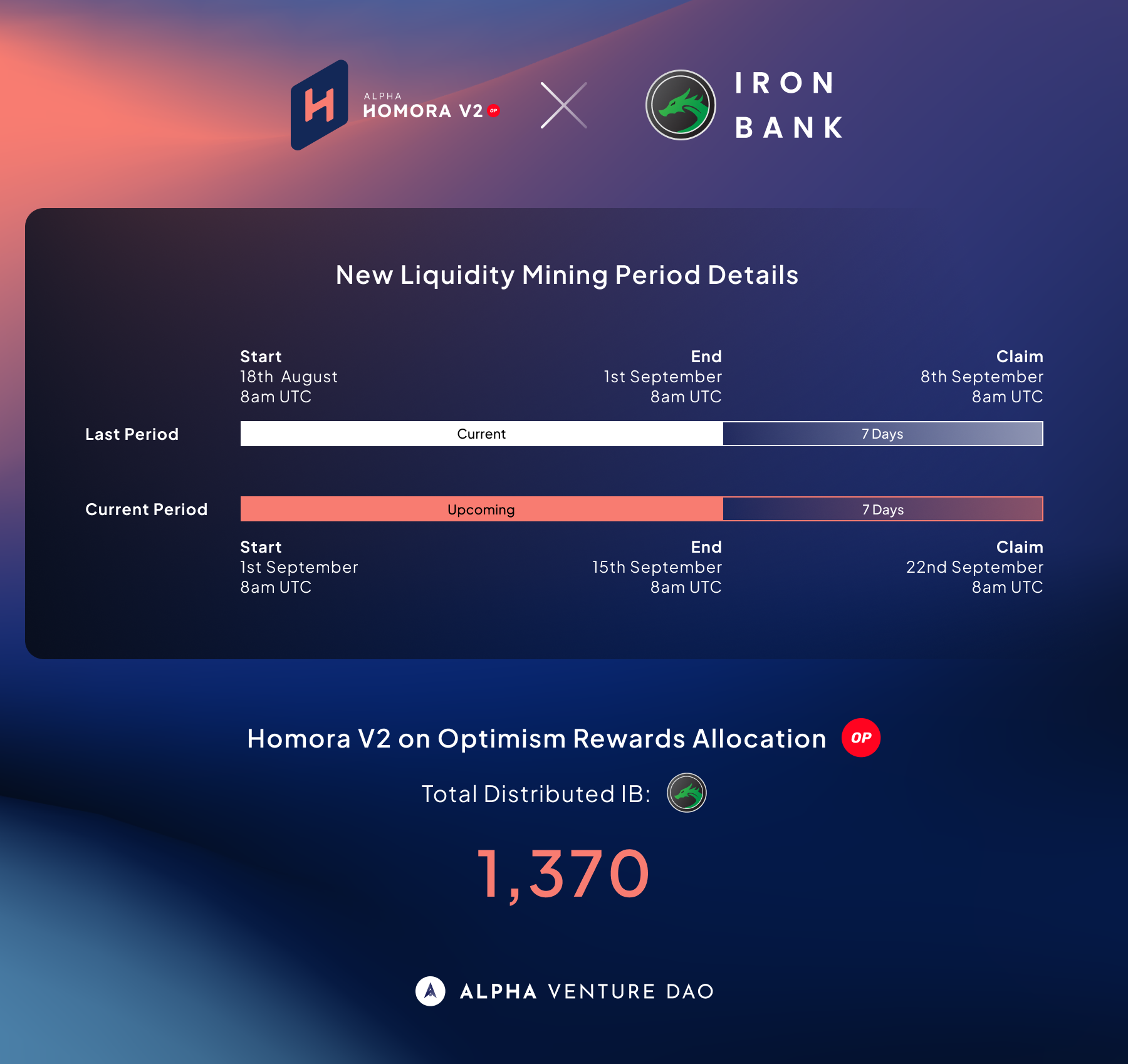 To kickoff our launch on Optimism, lenders will be eligible for liquidity mining rewards from Iron Bank in the form of IB tokens. Currently, there will be a total two liquidity mining periods available which will run for 2 weeks each.