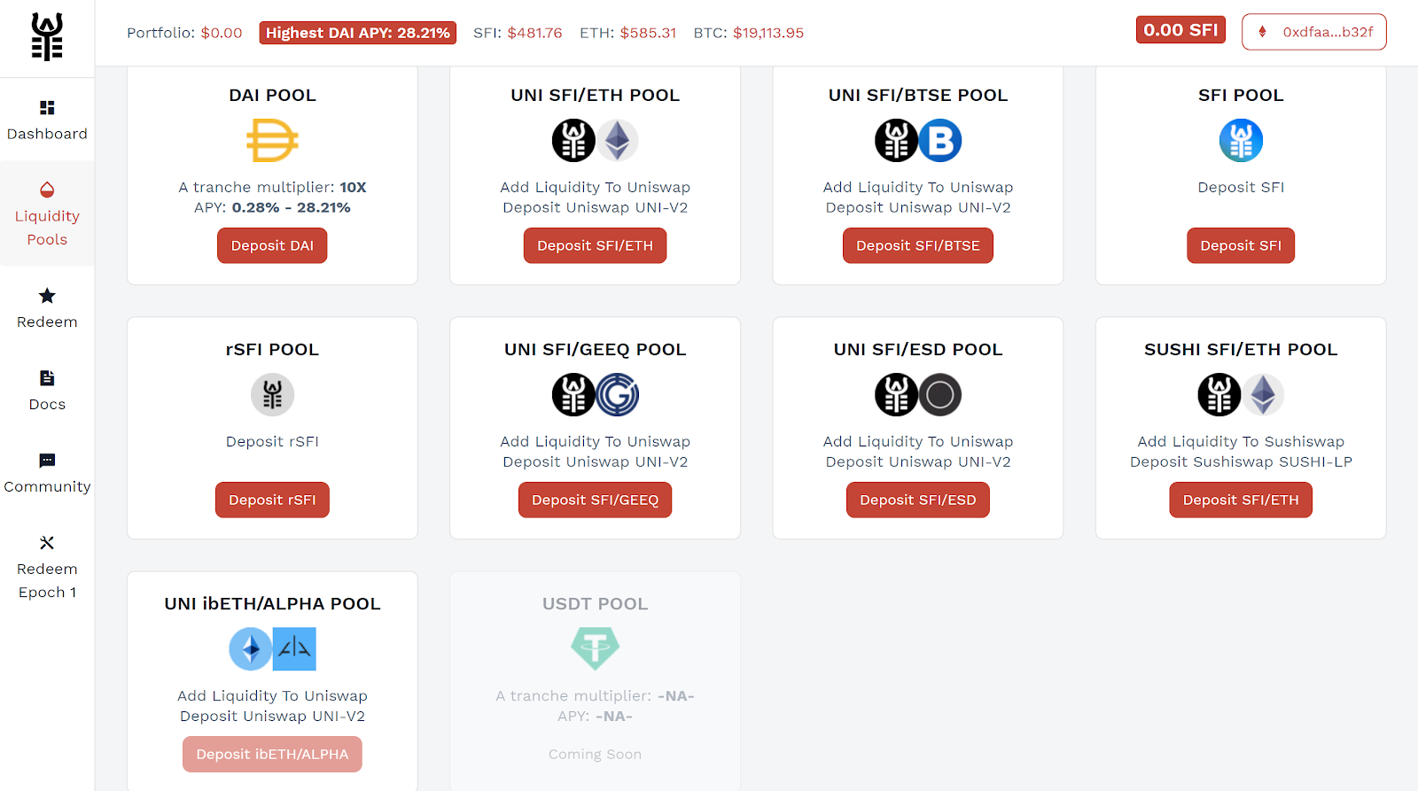 Step 4: After each epoch, liquidity providers can claim SFI and remove liquidity by selecting the Redeem tab. This means that the first day that you can claim SFI rewards is Dec 27th, 2PM UTC.